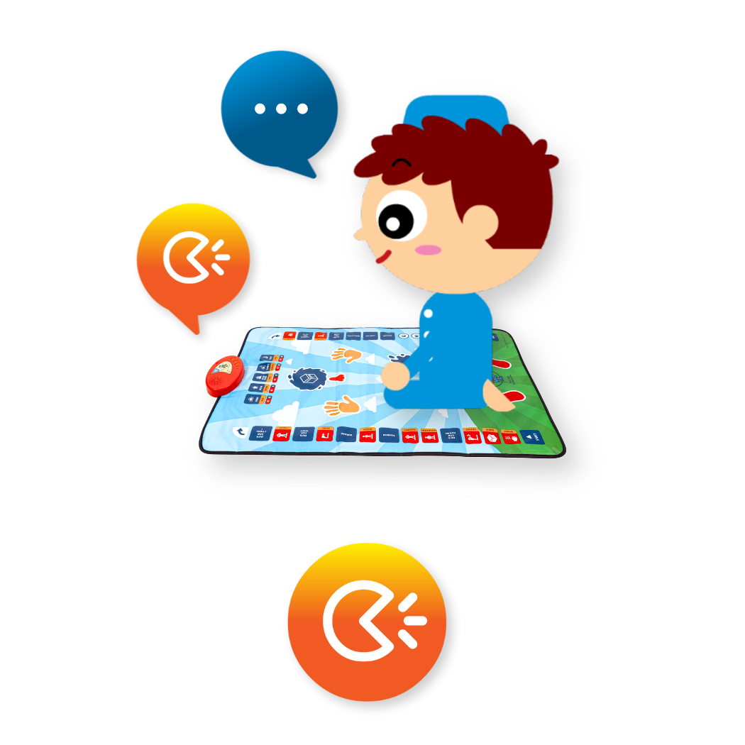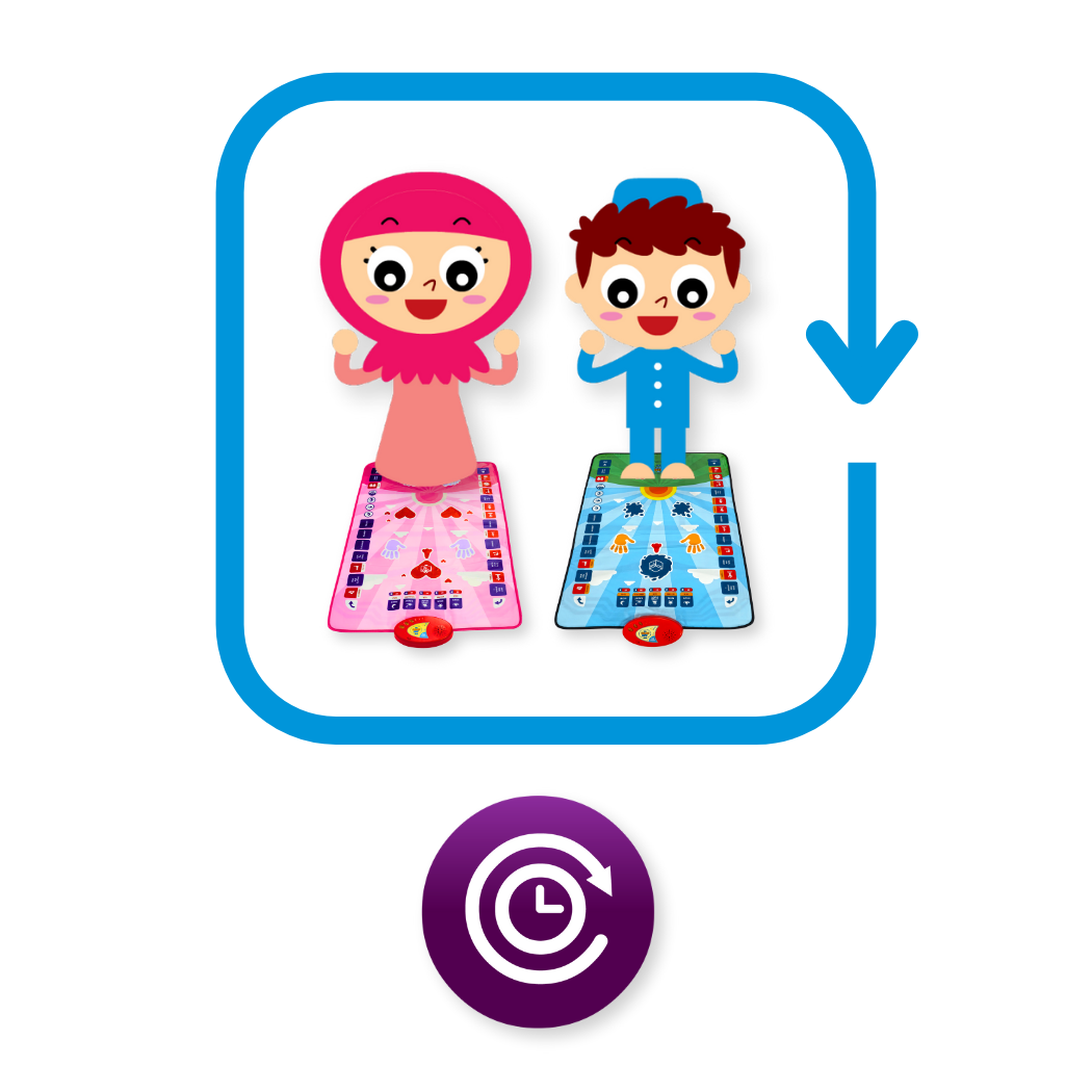 Built-In Sensors! The mat is equipped with touch-sensitive sensors placed where the hands, feet, and forehead go during prayer. These sensors guide your child step-by-step through Salah, responding to their movements with instructions, Qur’an recitations, and Duas.